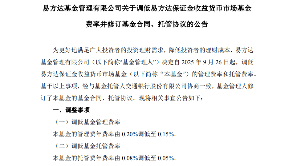 从行业层面看,货币基金的费率正出现“组团下调”的趋势。当天,易方达保证金收益货币市场基金公告自9月26日起将管理费率由0.20%降至0.15%,托管费率由0.08%降至0.05%;国新国证现金增利货币市场基金自9月23日起将管理费率由0.30%降至0.20%、托管费率由0.10%降至0.07%。多家基金公司在公告中称,调整旨在更好满足投资者理财需求、降低投资成本。